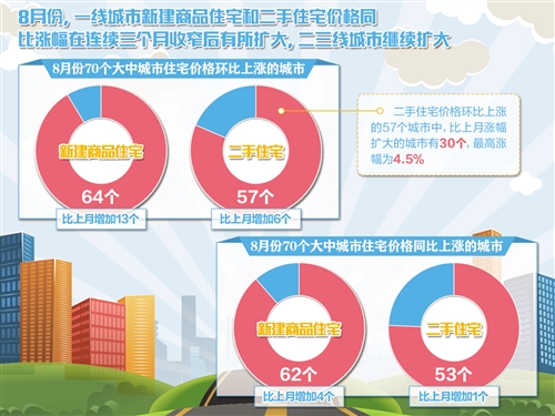 国家统计局城市司高级统计师刘建伟说,在8月份新建商品住宅价格环比上涨的64个城市中,比上月涨幅扩大的城市有31个,涨幅在1%以上的城市有25个。二手住宅价格环比上涨的57个城市中,比上月涨幅扩大的城市有30个,涨幅在1%以上的城市有18个。“分城看,一二三线城市新建商品住宅和二手住宅价格环比涨幅均比上月有所扩大。”