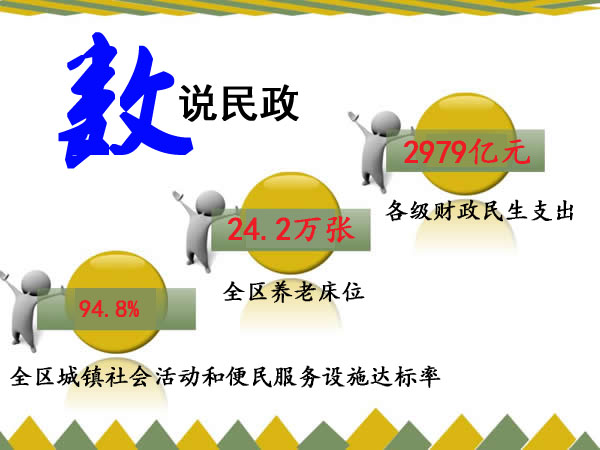 2016年全区民政系统切实保障和改善民生,各项民政事业整体推进,民生保障水平稳步提升,保障覆盖范围进一步扩大,各级财政民生支出2979亿元,困难群众基本生活保障水平始终处于全国前列。养老服务全面推进,全区养老床位达24.2万张,全区每千名老人拥有床位数处于全国领先水平。城乡社区治理体系不断完善,全区城镇社会活动和便民服务设施达标率达到94.8%,切实打通服务群众的“最后一公里”。