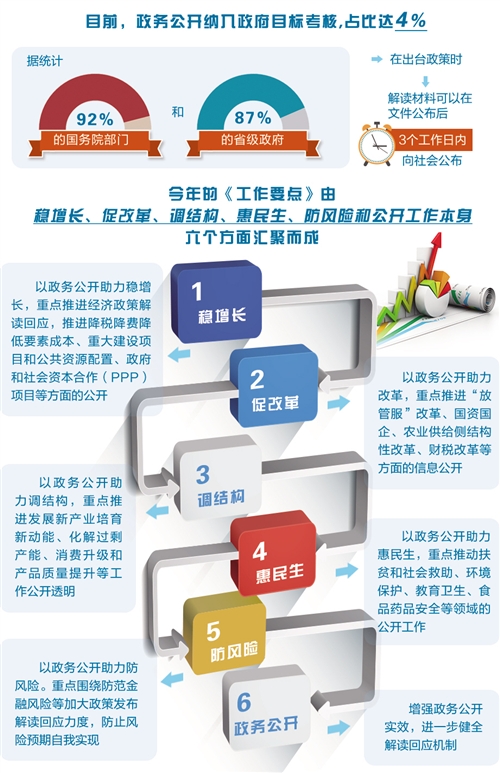 政务公开,不仅仅是信息公开,还是在制度建设上积极促进经济社会发展。相关专家表示,今年《工作要点》最大亮点之一,就是围绕供给侧结构性改革主线和稳中求进工作总基调,强调以公开稳预期、以公开凝聚共识。