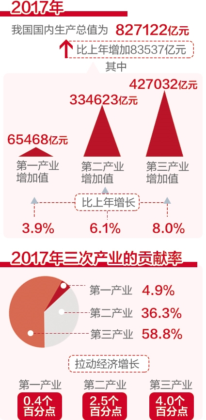 2017年,服务业增加值427032亿元,占全国GDP比重为51.6%;服务业增加值比上年增长8.0%,比国内生产总值和第二产业增加值增速分别高出1.1个百分点和1.9个百分点,已连续5年在三次产业中领跑;服务业增长对国民经济增长的贡献率为58.8%,比第二产业高出22.5个百分点;拉动全国GDP增长4.0个百分点,比第二产业高出1.5个百分点。