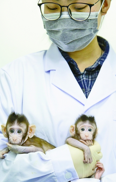 中科院神经科学研究所孙强团队成功突破了现有技术无法克隆灵长类动物的世界难题。图为克隆猴“中中”和“华华”被护士抱在怀里(一月二十二日摄)。新华社记者 金立旺 摄