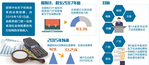 据统计,截至2017年底,全国有24个省区市税务部门不同程度参与了社保费征收,征收额已占到全国社保费总收入的43.3%。