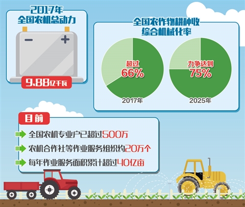 “我国已成为世界第一农机生产大国和使用大国,农业生产方式实现了从主要依靠人力畜力到主要依靠机械动力的历史性转变。”在12月19日举行的国务院政策例行吹风会上,农业农村部副部长张桃林表示,2017年全国农机总动力达到9.88亿千瓦,农作物耕种收综合机械化率超过66%。力争到2025年,农作物耕种收综合机械化率达到75%,粮棉油糖主产区(县)基本实现农业机械化。