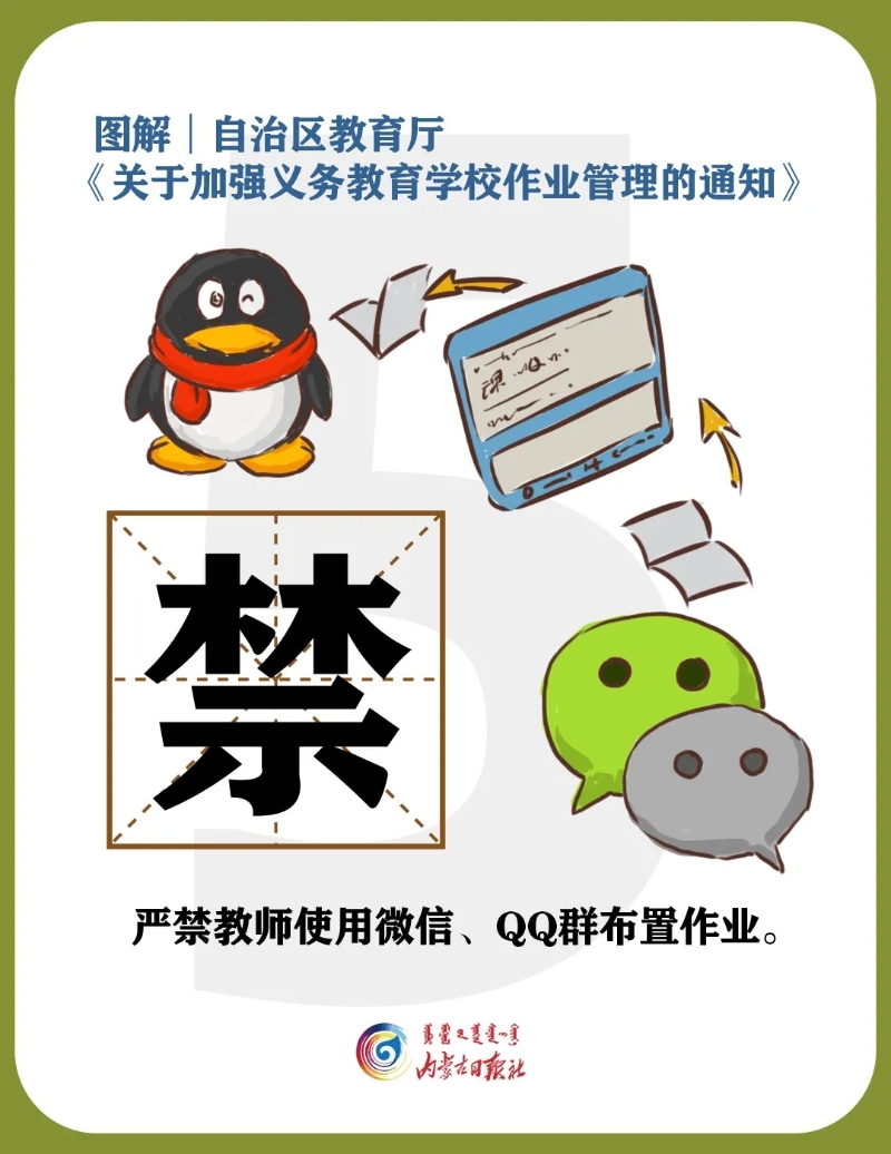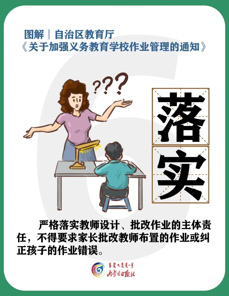 此外,自治区要求各校要强化家校合作,避免“校内减负、校外增负”现象,保障学生睡眠。各地要严格控制各类社会性事务进校园,切实减轻督查检查评比考核和抽调借用中小学教师带来的负担,保障教师正常开展教育教学和批改作业时间。教育督导部门要及时调整完善学校规范办学行为的督导评估指标,把学校的作业质量、作业负担等情况纳入督导内容。对作业管理中问题较多、监管不力的学校和违规要求家长代批改作业的教师要严肃处理,通报问责。