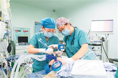 6月3日,在北京市第六医院的医联体胸外科病房手术室,麻醉医生应用可视化技术进行气管插管。新华社记者 才扬 摄