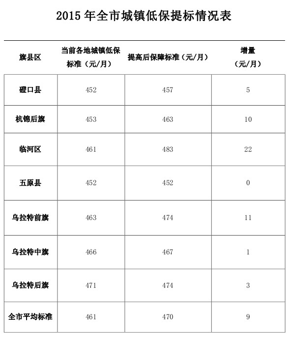 目前, 我市农牧区低保保障标准年均增长率已经达到自 治区要求, 城镇低保保障标准年均增长率还低于自 治区要求 0.5 个百分点。 按照自治区要求,我市将调整 2015 年城镇低保标准, 确保达到“十二五” 时期低保标准年均增长 10%的目标。 经测算, 城市低保要在现行保障标准每月 461 元的基础上, 增加 9 元, 达到每月 470 元(各旗县区提标情况见附表)。 新的保障标准从 2015年 11 月 起执行。