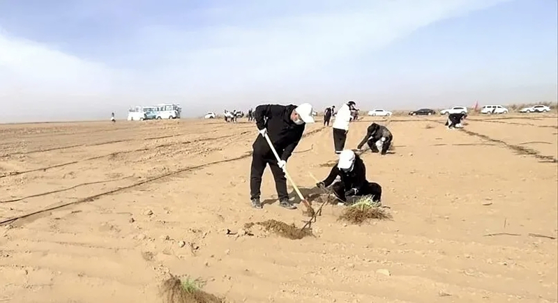 在乌兰布和沙漠生态治理区,磴口县党员干部、青年志愿者等在林业技术人员的指导下,分工协作,挖坑、扶苗、覆土、踩实,一番忙碌后,一行行新苗沿着滴灌带在沙地上迎风挺立,逐渐成行、成带、成网。“今天共完成绿化面积400亩,栽植四翅滨藜树苗5万余株。我们全程安排技术员跟班作业,指导大家规范种植,确保栽一棵、活一棵、绿一片,全力保障植树造林工作实效。”磴口县防沙治沙局副局长姜龙文说。