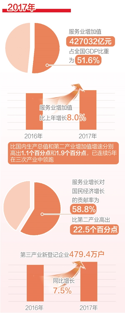 2017年,服务业增加值427032亿元,占全国GDP比重为51.6%;服务业增加值比上年增长8.0%,比国内生产总值和第二产业增加值增速分别高出1.1个百分点和1.9个百分点,已连续5年在三次产业中领跑;服务业增长对国民经济增长的贡献率为58.8%,比第二产业高出22.5个百分点;拉动全国GDP增长4.0个百分点,比第二产业高出1.5个百分点。