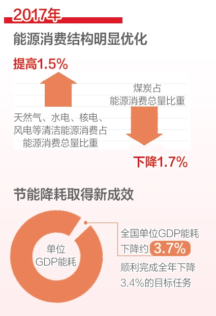 2017年,随着生态文明建设步伐加快,绿色发展各项措施有效实施,能源供给侧结构性改革持续推进,以及“一带一路”能源国际合作广泛开展,我国能源生产和消费革命不断深化,能源清洁化进程进一步加快,能源供应总体平稳,能源消费结构明显优化,节能降耗取得新成效。